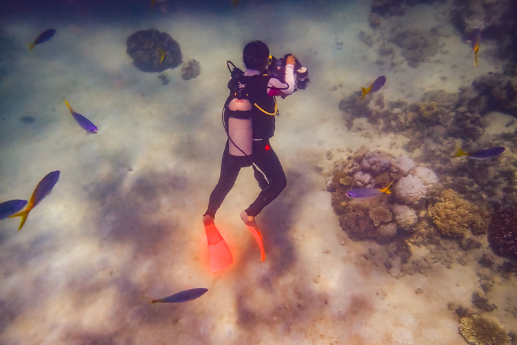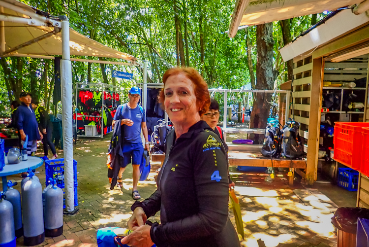 We have an hour before the next boat so we take advantage of the local burger stand and get a Seafood Plate with Fries and a Burger with Fries, and chow down before we queue up for the Dive Boat. Once on the Dive Boat with several Snorkelers and a few Divers, we cruise out only a hundred yards or so before setting anchor.