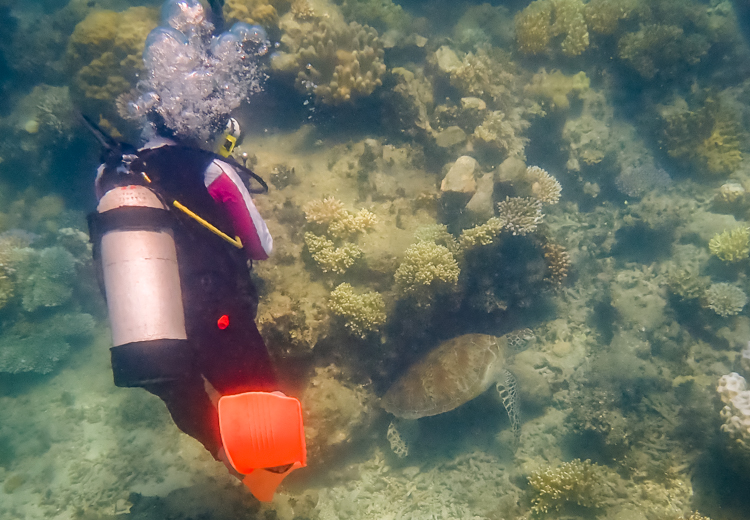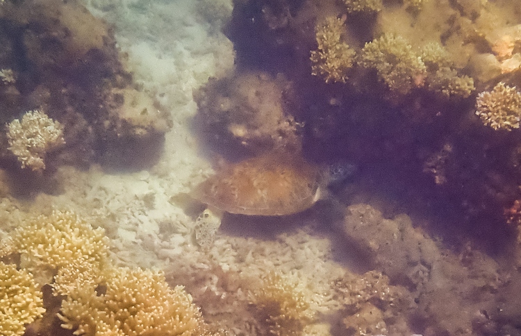 We gear up and get in the water to find random colorful fish and corals as we snorkel around the boat. We come across Sea Turtles and the Divers from the boat and my camera cheers for me. As I move around in the water, many sights display themselves to us and suddenly Sea Turtles appear near the Divers. It turns out the Divers found the Turtles and I find the Divers. A Win-Win for all of us!