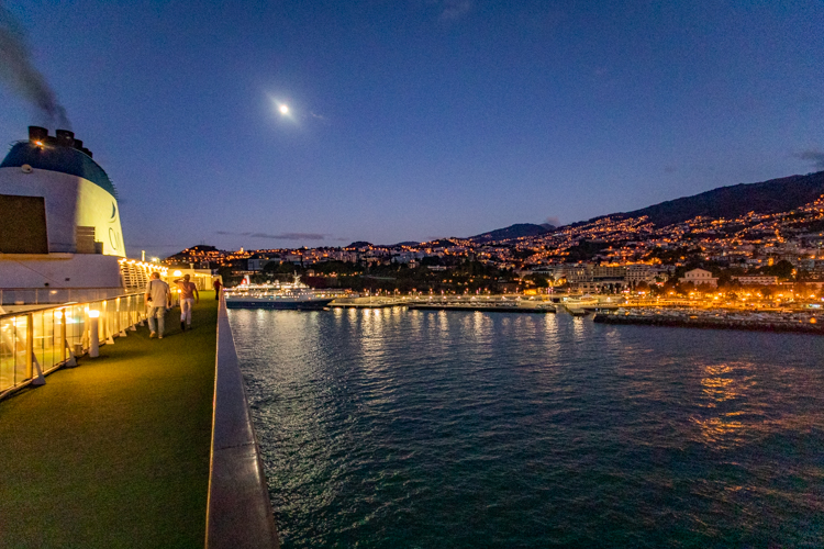 We arrive in Funchal, Madeira this morning. Some fun photos of the island lights as we come in to dock in the dark. Breakfast and it’s time to get off the boat. Excitement levels build as we prepare to visit another place in the world we’ve never seen. There are 2 other ships in port but nothing as big as ours. Even though our ship isn’t big as cruise ships go.
