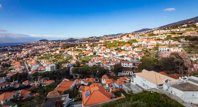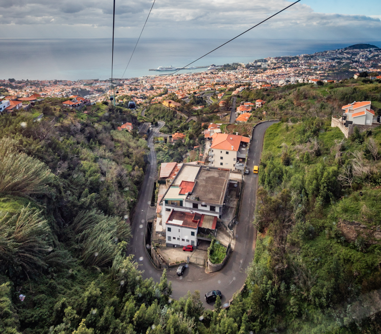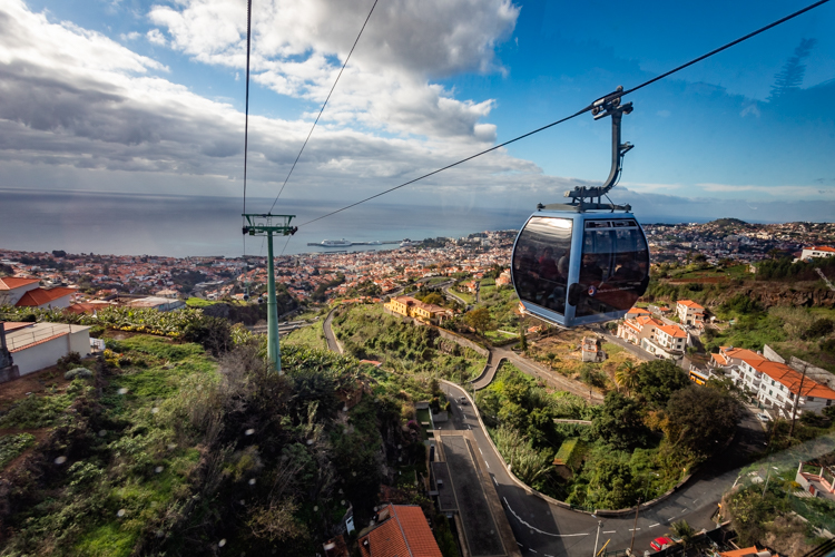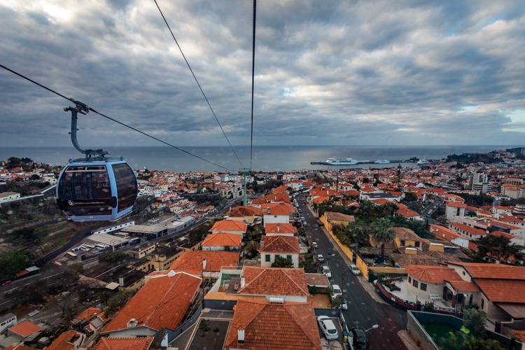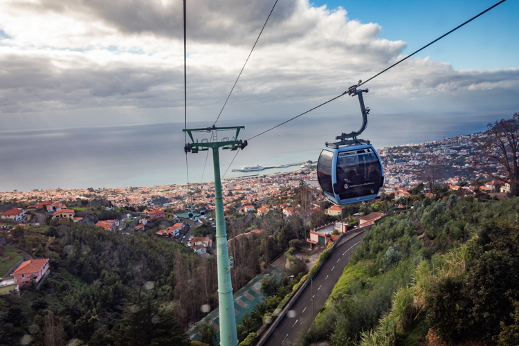 Well, now all we have to do is find the Cable Car, known locally as the Teleferico. We ask a couple locals but they don’t speak English and they don’t understand our question. We meet one local who recognizes the word Teleferico, and he is happy to chatter on in Portuguese and we get his hand gestures and a few words like Mercado (market) and we head in the direction he indicates. Then we see the Teleferico and find the ticket booth. Another couple from our ship has found it before us and we get in the queue behind them. We have to wait 15 more minutes until they open. 22 Euros and we have tickets. Soon we are in the cable car and heading up the mountain, camera lenses happily clicking away.