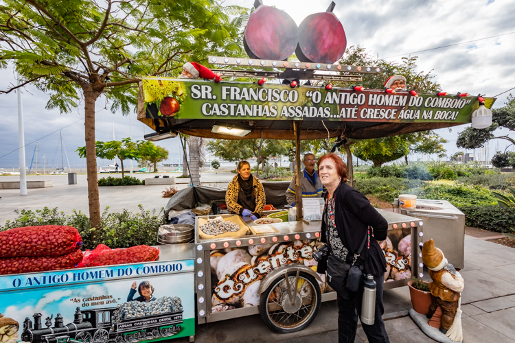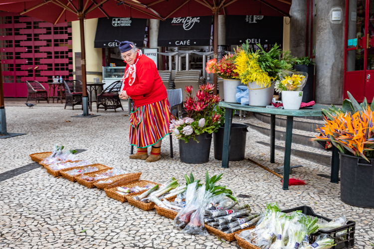We go up to the third floor of the museum where they have a restaurant and we chat with our waiter and ask him what they have for local fare. He suggests Limpits, here they spell it “Lampas”. They are single shell mollusks (think Abalone, only the size of Mussels) that they cook in garlic and butter. We already understand that garlic and butter makes everything delicious! And we weren’t disappointed! Lampas were delicious! Walking about town, we browse the shops, most of which are closed because it’s Sunday. Streets, for the most part, are paved with colorful designs and are a pleasant backdrop for our photos. The name, “Funchal”, translates to Fennel. So we ask restaurant after restaurant for a dish using Fennel. Interesting that we couldn’t find any.